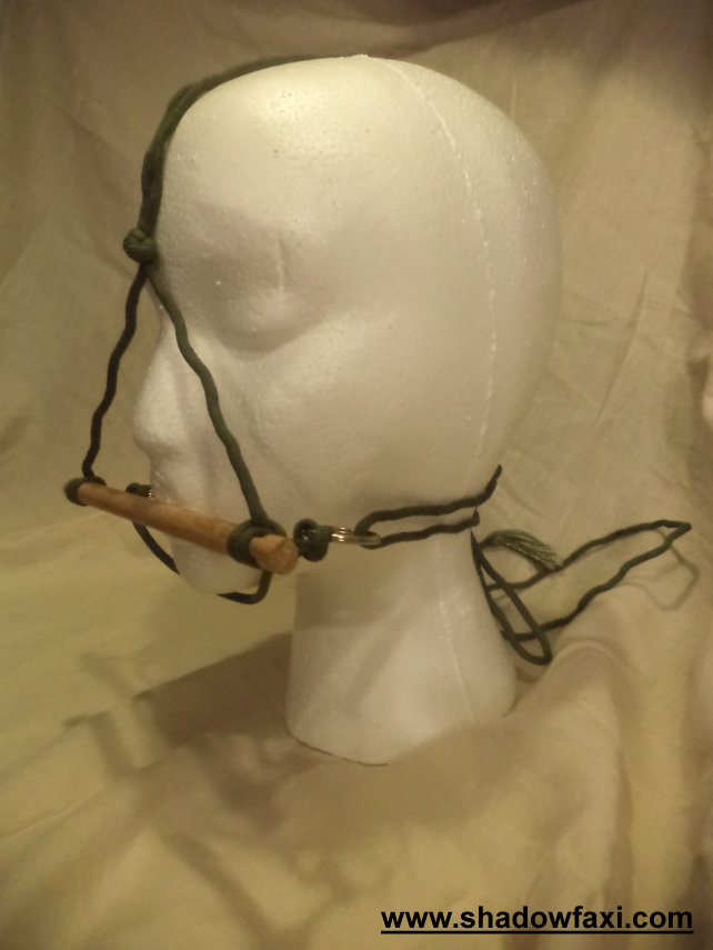 Recently, my Trainer and i decided to try out the “Easy Ponygirl Bitgag“. Looking around the house, i found some paracord and a 3/8” wood dowel. It took me longer to whittle the notches in the wood (about 10 minutes) than it took to tie the harness. I opted for using keyrings instead of knot loops.